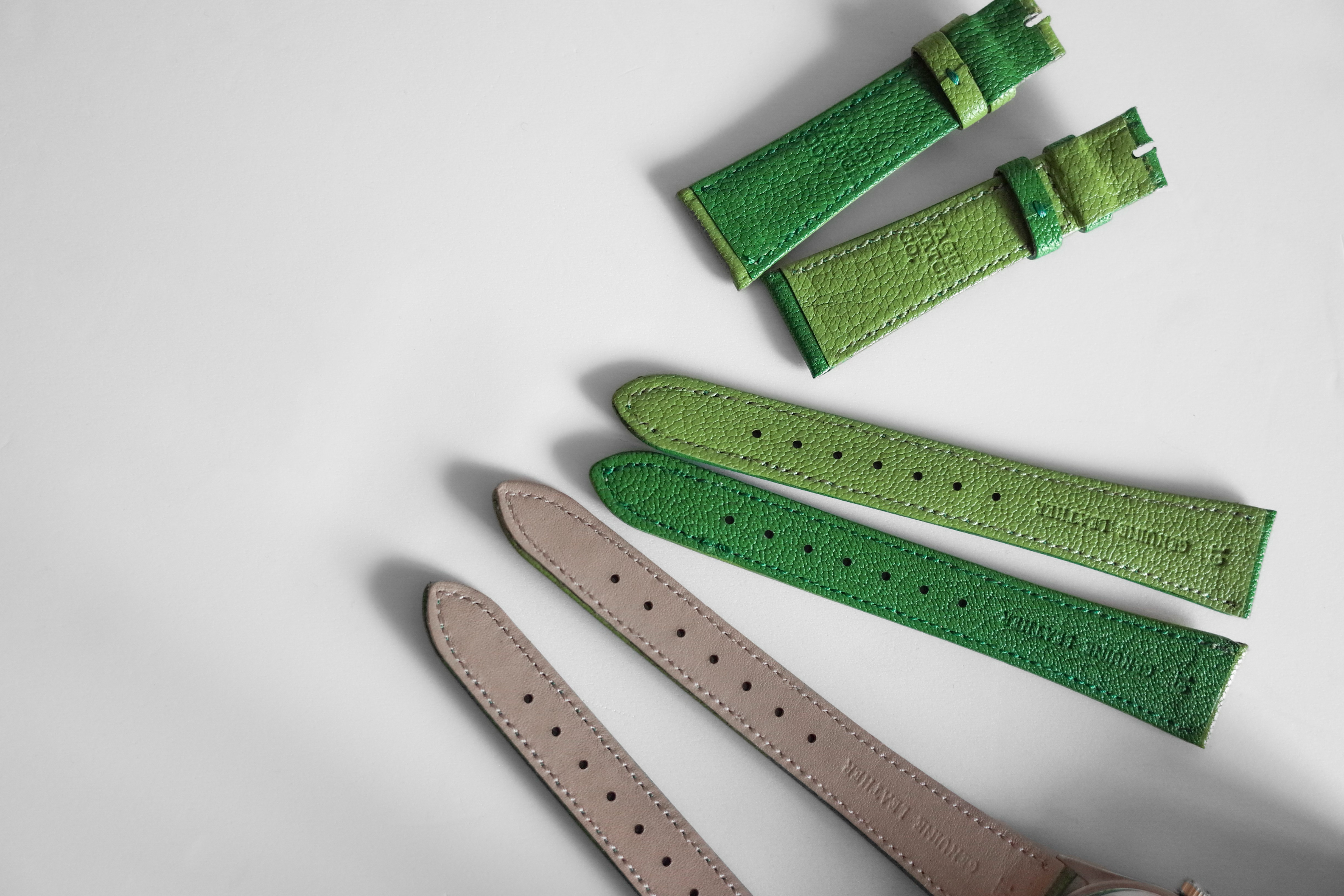 きめ細かな天然シボと鮮やかな発色が魅力で時計のベルトとしても、手元を映えさせながらも上品な印象を与えます。